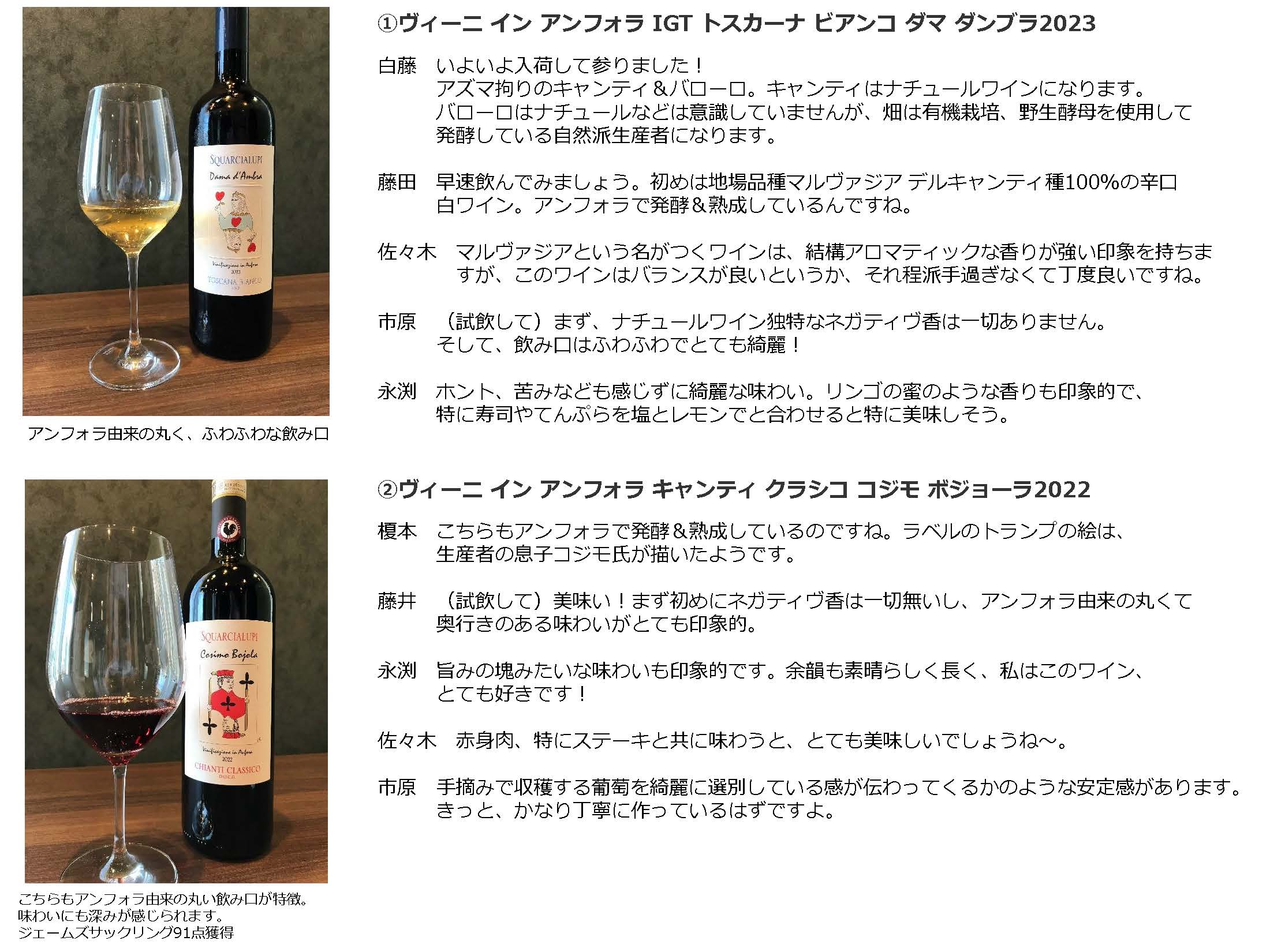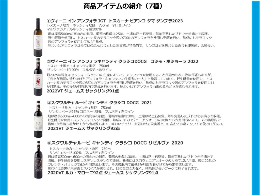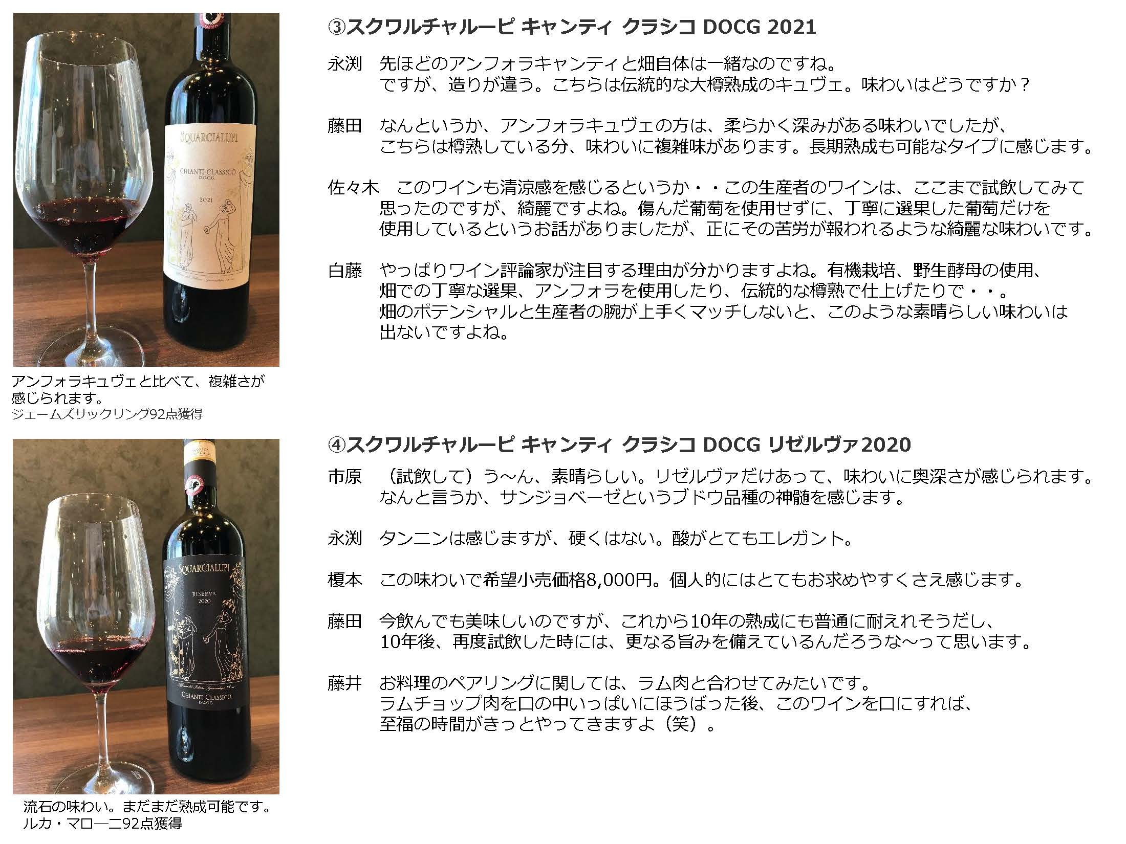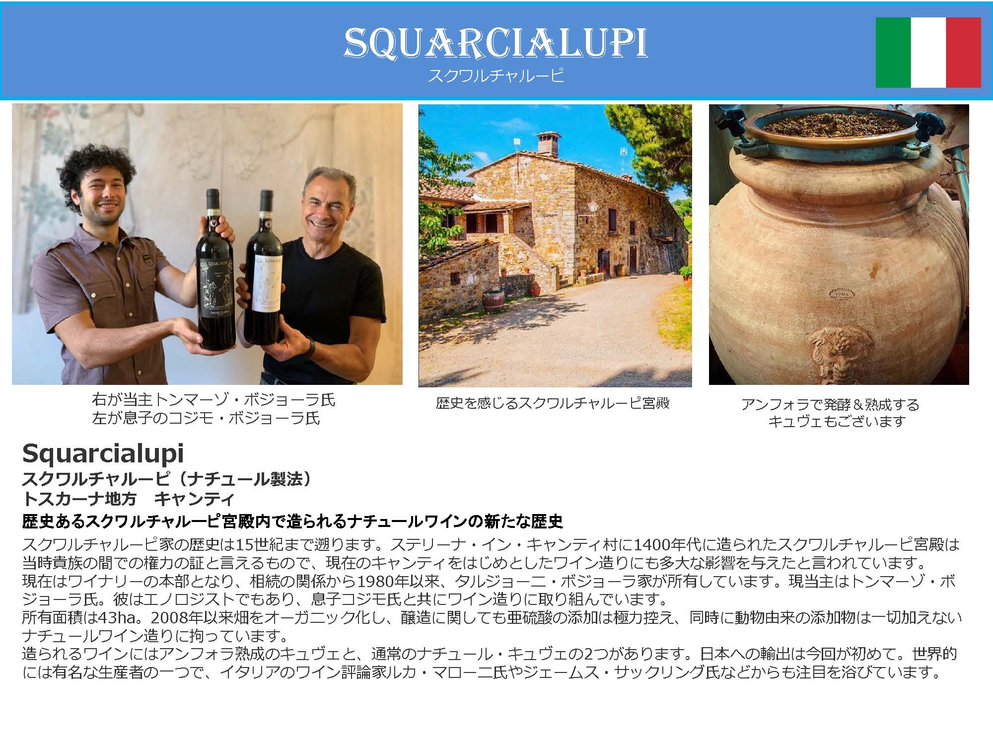 力強さと繊細さを併せ持つキャンティ・クラシコ、「スクワルチャルーピ」の歴史は長く15世紀まで遡ります。「ワインの王」と呼ばれる堂々たるバローロ。「カルロリベッロ&フィリ」は2016年に祖父から受け継ぎ、息子と二人三脚でワインつくりを行います。